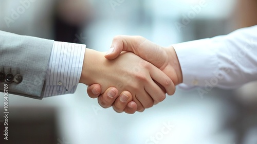 Young Business Professionals Engaging in a Firm Handshake in a Modern Office Setting, Symbolizing Collaboration and Professional Relationships