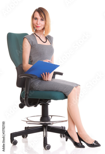 young business woman sitting with her clipboard isolated