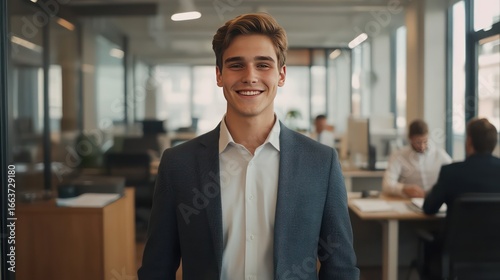 Young businessman in gray suit smiling, colleagues collaborating in modern offic