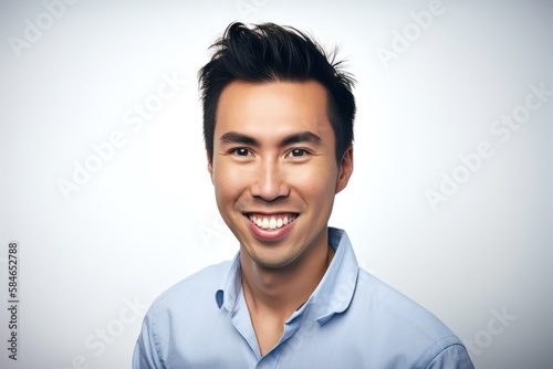 Young businessman smiling happily in blue shirt on white background. Photo generative AI