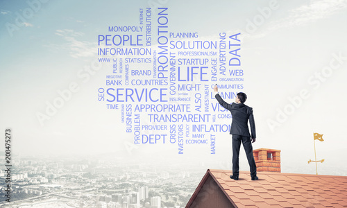 Young businessman standing on house roof and writing leadership