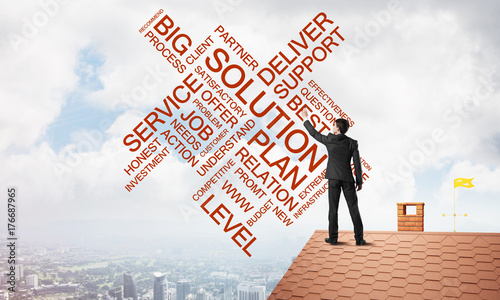 Young businessman standing on house roof and writing leadership skill concept. Mixed media