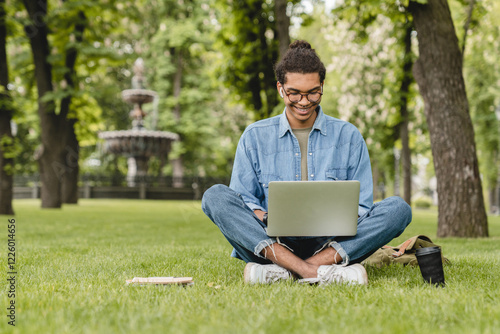 Young businessman student freelancer tutor using laptop for doing homework, e-learning, distant remote work job occupation, checking e-mails, e-banking online sitting on green grass lawn