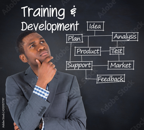 Young businessman thinking against blackboard with business buzzwords