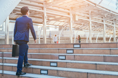 Young businessman walking in city for going to work with cityscape background.