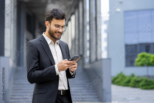 Young businessman wearing glasses and suit standing outdoors against an urban building, smiling while using mobile phone for communication and business