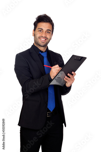 Young businessman with blue tie with a clipboard