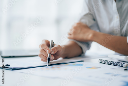 Young businesswoman analyzes cost graphs on desk in conference room with laptop