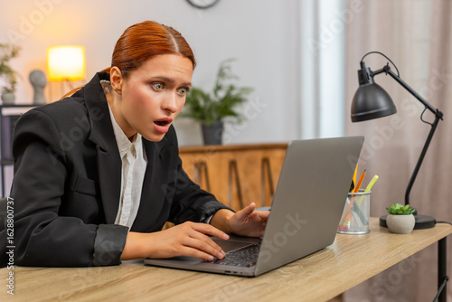 Young businesswoman at home office audits bills on laptop when wrong number appears eyes widen. Freelancer girl at table fixes digits typing correct figures feels quick relief as budget recovers again