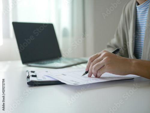 Young businesswoman holds a resume and evaluates it. Views the personal history of job applicants. Recruitment concept