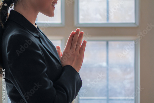 young businesswoman is raising her hands as traditional Thai greeting and saying hello. Raising hands is a beautiful Thai tradition to greet and show respect.concept of friendship, love and kindness