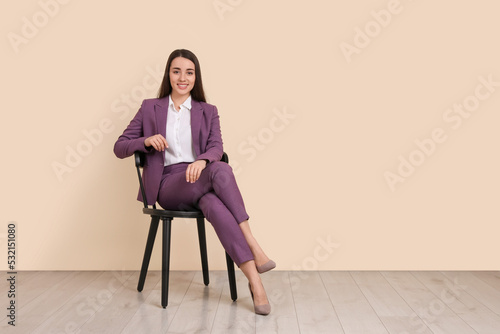 Young businesswoman sitting on chair near beige wall in office, space for text