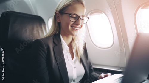 Young businesswoman travels business class aboard a private jet. Woman works on a laptop near the porthole. Business traveling concept.
