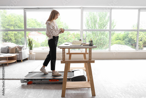 Young businesswoman with notebook training on treadmill at table in office