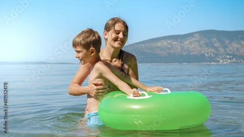 Young caring mother helping her little son getting inside the inflatable swimming ring in the sea. Family holiday, vacation and fun summertime of children and parents.