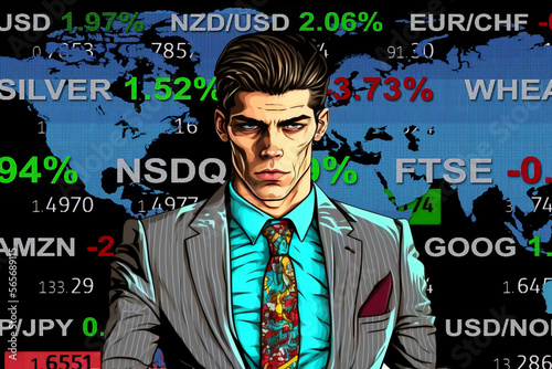 young cartoon comix businessman standing in front of a real stock market wold map chart - new quality creative financial business stock image design