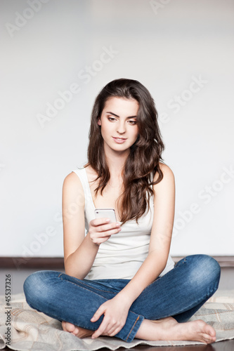 young casual happy smiling brunette girl with cell phone