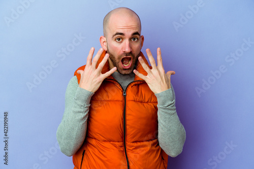 Young caucasian bald man isolated on purple background showing number ten with hands.