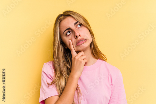 Young caucasian blonde woman isolated on yellow background crying, unhappy with something, agony and confusion concept.