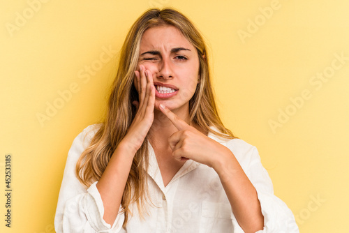 Young caucasian blonde woman isolated on yellow background having a strong teeth pain, molar ache.