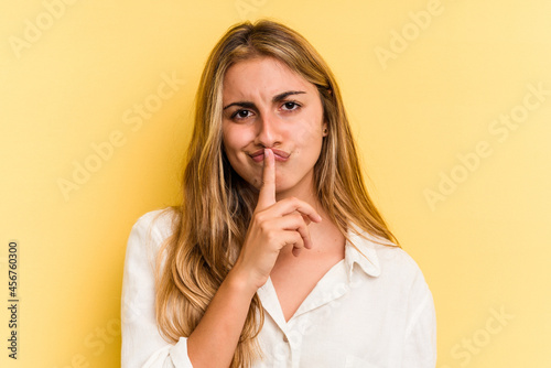 Young caucasian blonde woman isolated on yellow background thinking and looking up, being reflective, contemplating, having a fantasy.