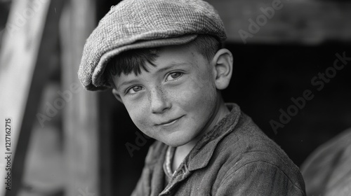 Young caucasian boy in flat cap smiling, black and white vintage style