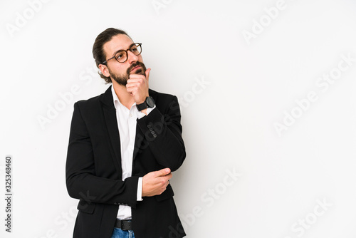 Young caucasian business man isolated on a white background looking sideways with doubtful and skeptical expression.