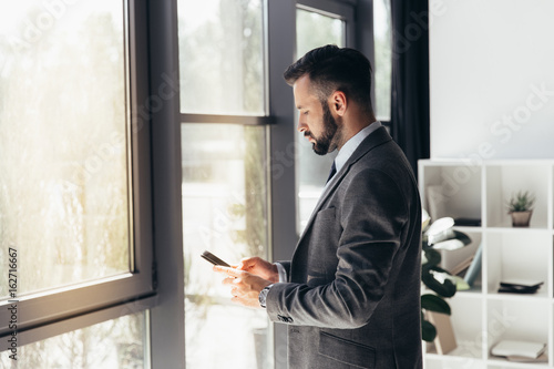 young caucasian businessman typing on smartphone at modern office