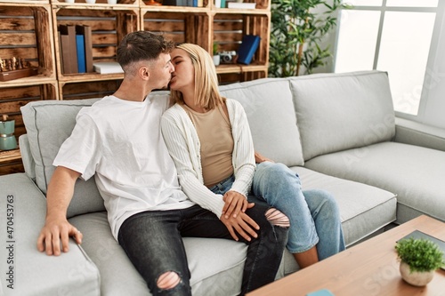 Young caucasian couple kissing and hugging sitting on the sofa at home.