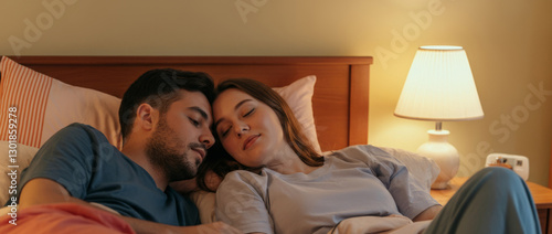 Young caucasian couple sleeping peacefully in bed with warm ambient lighting