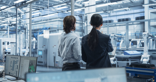 Young Caucasian Engineer and Asian Technician Having a Conversation and Using a Laptop Computer. Specialists Monitoring, Analyzing Conditions at a Modern Electronics Factory with Automated Conveyor