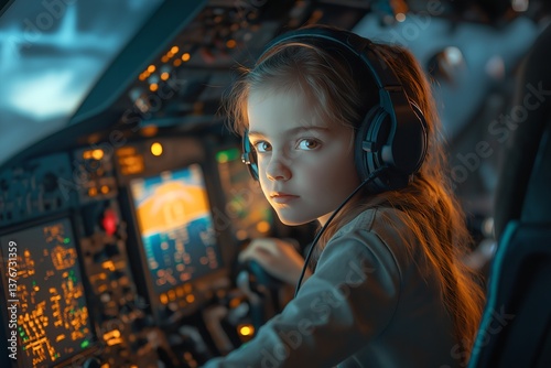 Young caucasian female child in aircraft cockpit wearing headset, surrounded by illuminated controls