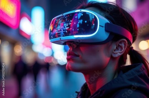 Young caucasian female experiencing virtual reality in urban nightscape