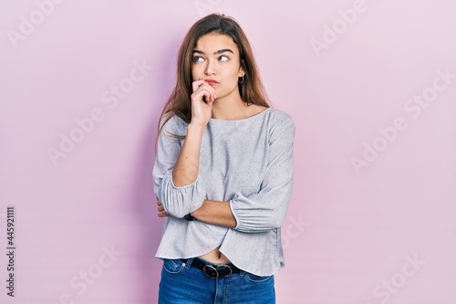 Young caucasian girl wearing casual clothes serious face thinking about question with hand on chin, thoughtful about confusing idea