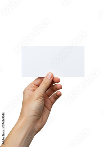 young caucasian hand with smooth skin and manicured fingernails precisely gripping a pristine, blank rectangular white card, isolated against a seamless high-key studio white background with ample