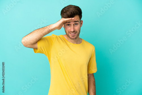 Young caucasian handsome man isolated on blue background looking far away with hand to look something