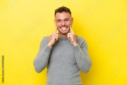 Young caucasian handsome man isolated on yellow background smiling with a happy and pleasant expression