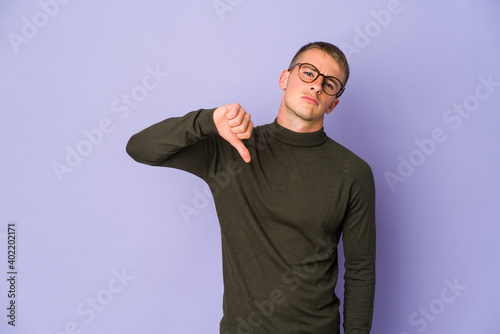 Young caucasian handsome man showing a dislike gesture, thumbs down. Disagreement concept.