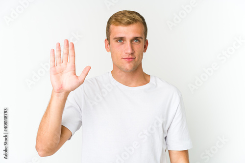 Young caucasian handsome man smiling cheerful showing number five with fingers.
