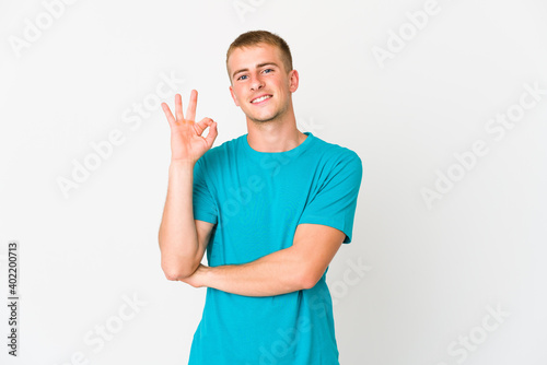 Young caucasian handsome man winks an eye and holds an okay gesture with hand.