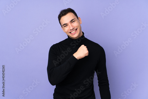 Young caucasian handsome man with turtleneck sweater isolated on purple background celebrating a victory