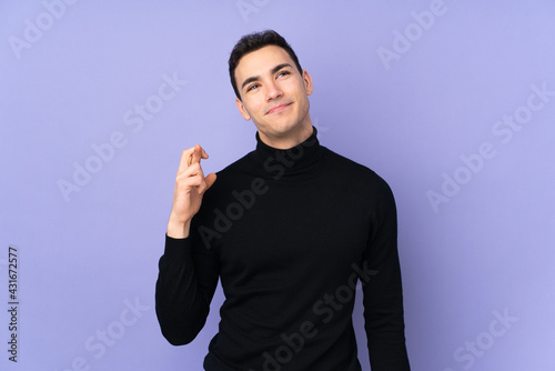 Young caucasian handsome man with turtleneck sweater isolated on purple background with fingers crossing and wishing the best