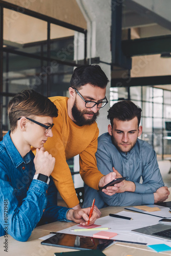 Young caucasian hipster guy chatting at networking and showing colleagues sms message on mobile phone while cooperating together in coworking space, concept of communication and partnership