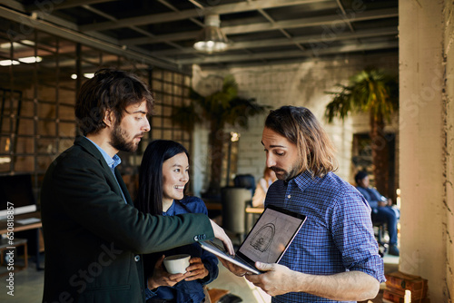 Young Caucasian male designer showing the progress of his work on a laptop to his colleagues