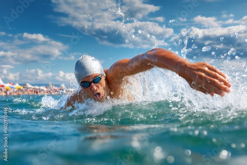 Young caucasian male swimmer in open water competitively freestyling under a bright blue sky