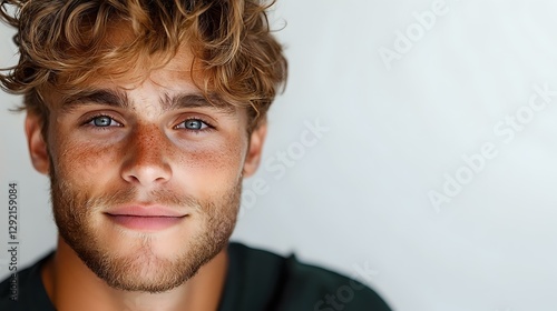 Young Caucasian male with curly blonde hair, blue eyes and stubble beard smiling confidently against white background. Close-up portrait showing genuine expression.