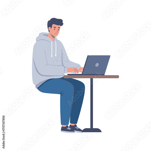 Young caucasian male working on laptop in casual attire at desk – flat illustration