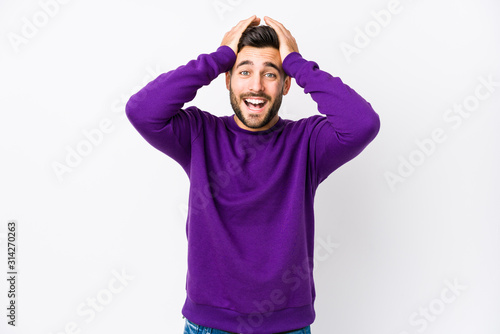 Young caucasian man against a white background isolated laughs joyfully keeping hands on head. Happiness concept.