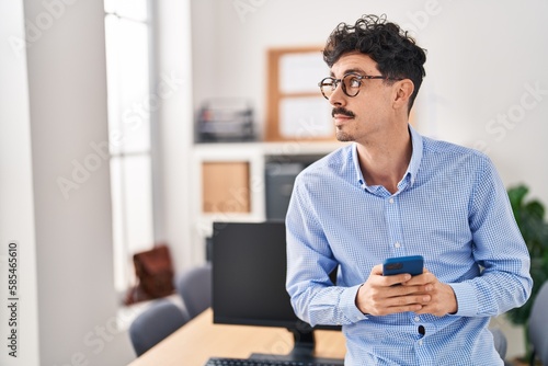 Young caucasian man business worker using smartphone at office