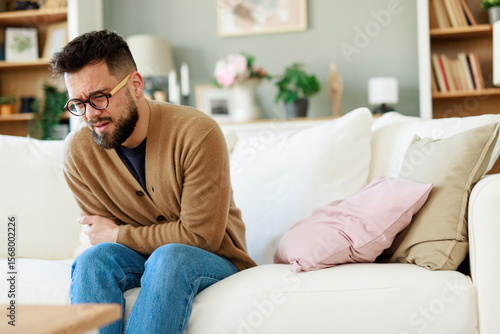 Young Caucasian Man Experiencing Pain on Sofa in Bright and Cozy Modern Living Room